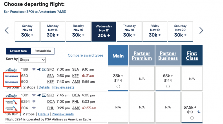 You can see that some of Alaska’s partner airlines, such as Icelandair and American Airlines, are automatically included in the search results. Some itineraries even include a mixture of flights operated by Alaska and its partners.