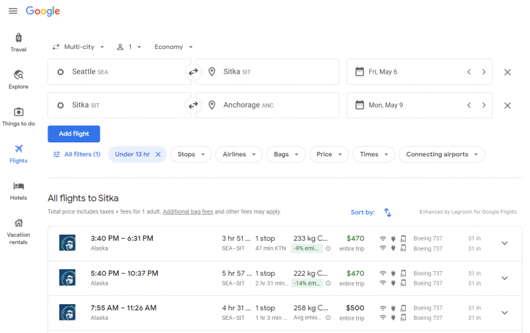 To find your flight options, we recommend using Google Flights. To fly from Seattle to Anchorage — or the reverse — on an Alaska Milk Run, you will need to perform a multi-city search.