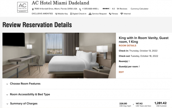 The cost for a five-night stay at AC Hotel Miami Dadeland for the same dates and room type is $1,281.