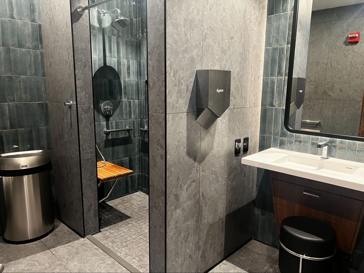 The shower suite gives guests a chance to wash up on a long layover, just be quick about it — the limit for most guests is 15 minutes. (Photo by Steve Miller)