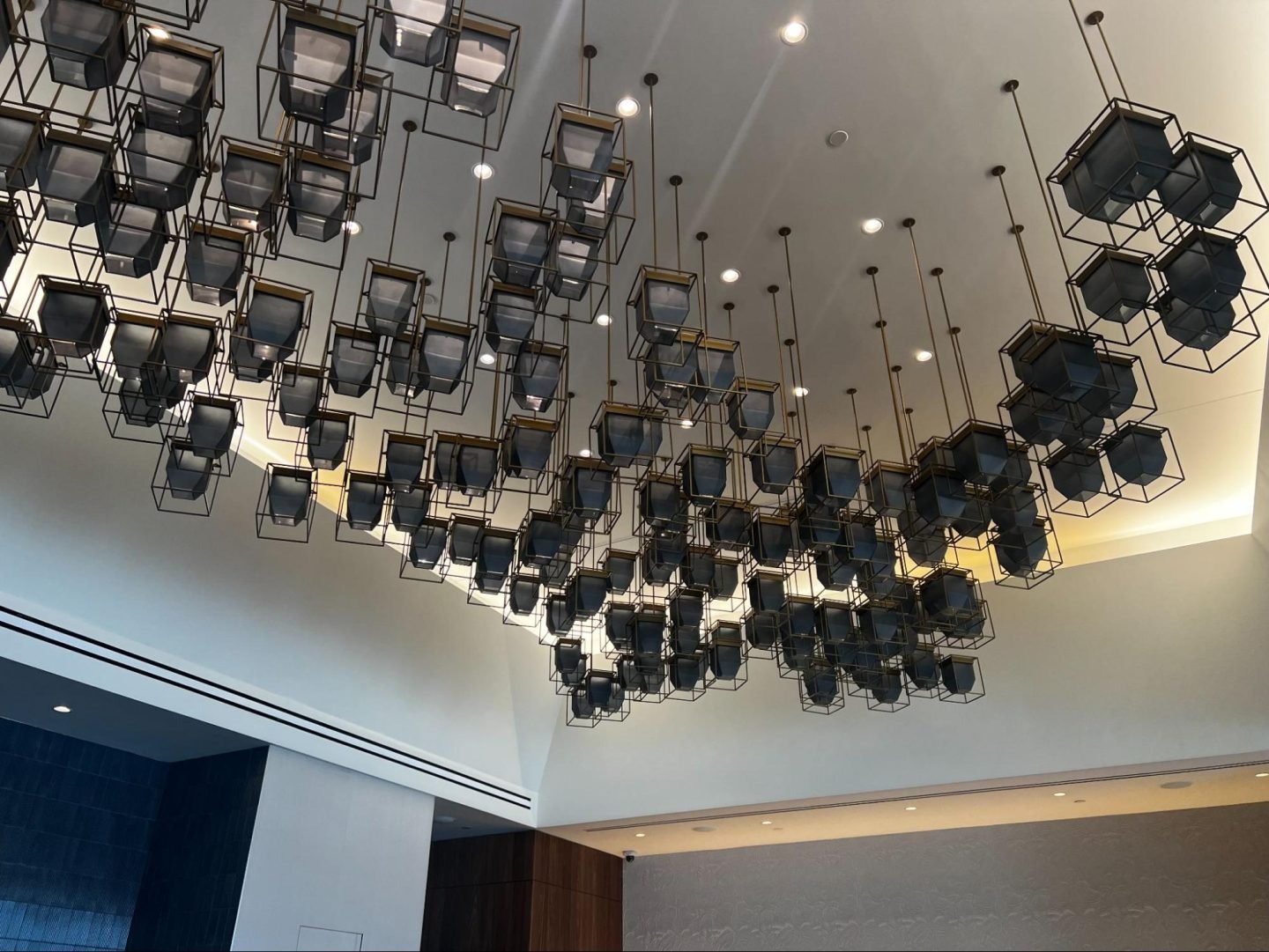 In the main dining area, a sculpture installation suspended from the ceiling features more than 260 lightless lanterns arranged in a pattern reminiscent of the nearby Potomac River. The “lanterns” are modeled after the actual markers used to delineate the boundaries of Washington, D.C., upon its founding in 1791.