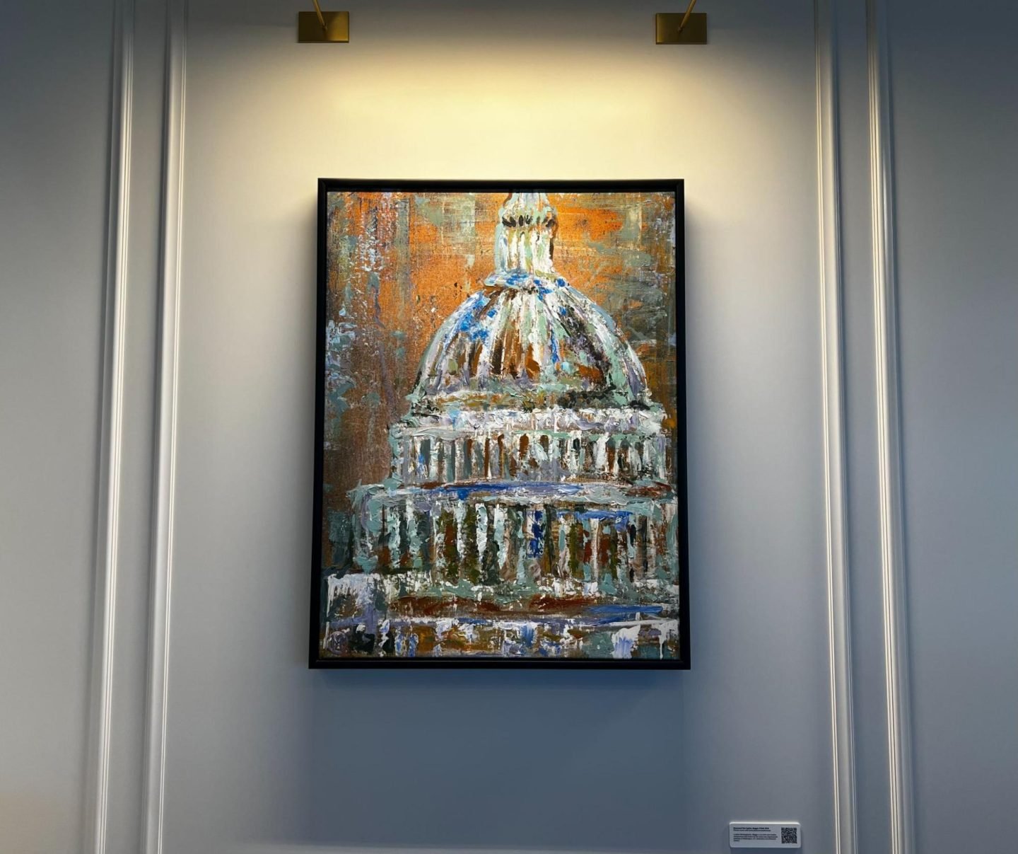 This painting of the U.S. Capitol building by pop impressionist and Washingtonian Maggie O’Neill hangs in the lounge’s lobby. (Photo by Steve Miller)