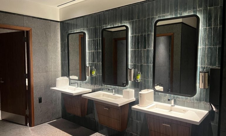 Each includes several stalls and sinks for use. The tiling, backlit mirrors and individual sink stations elevate the bathroom to match the rest of the lounge.