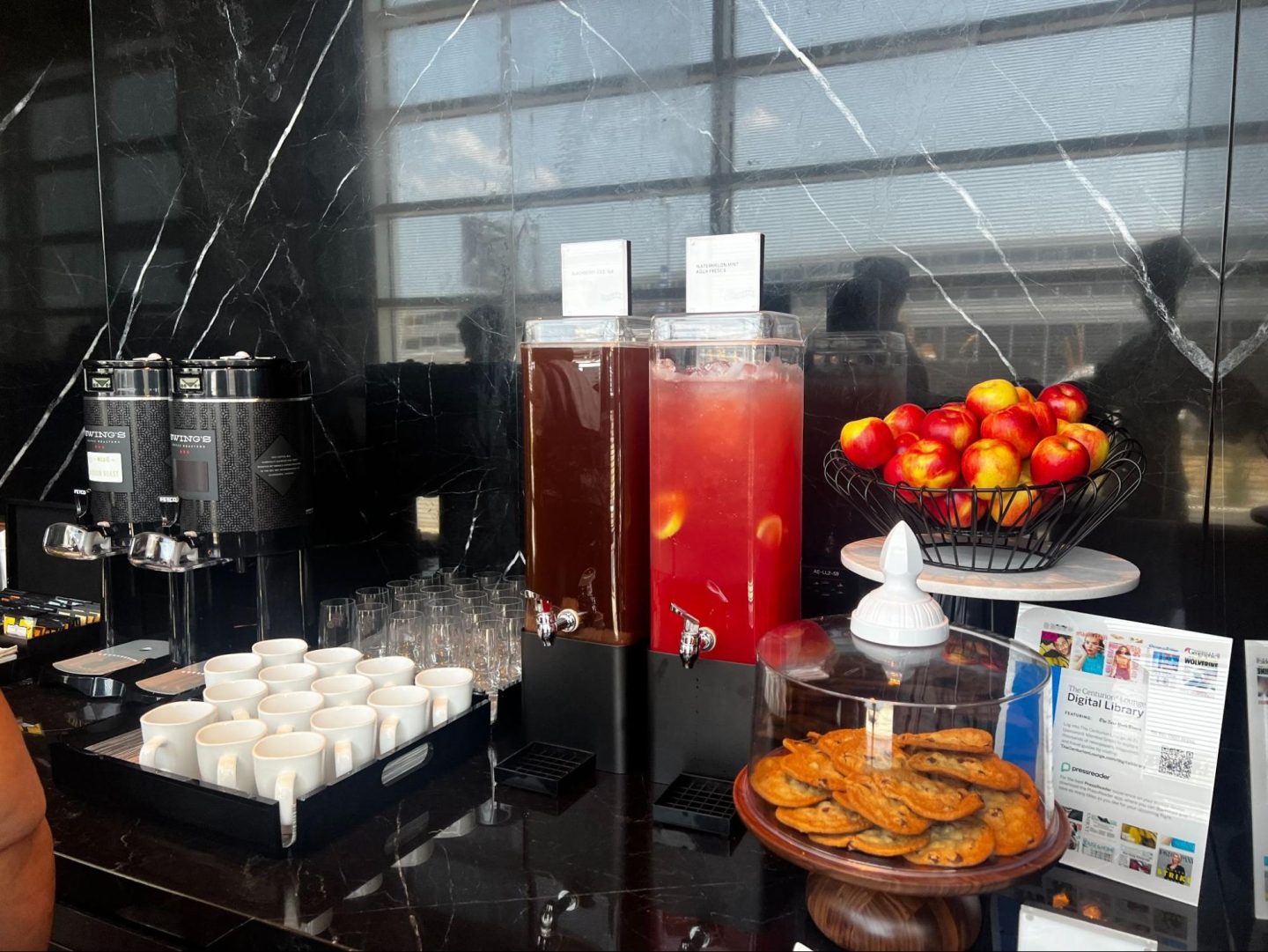 Guests looking for something simple to sip can top off their coffee or tea at one of the lounge’s beverage stations. (Photo by Steve Miller)