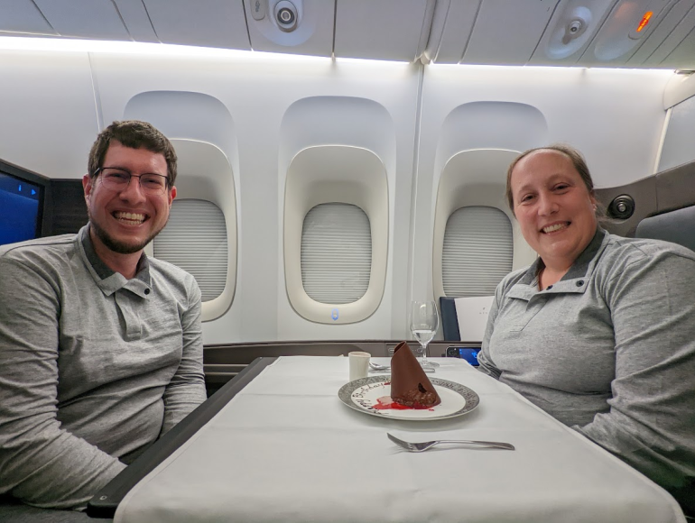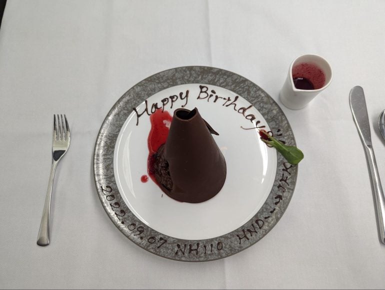 ANA also earned points by providing above-and-beyond service for my wife's birthday — something that we didn't communicate to the airline ahead of the flight. For dessert, our two flight attendants brought out Katie's dessert on a plate marked with "Happy Birthday" and the date and number of our flight.
