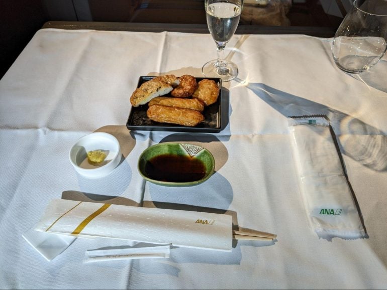 If you get peckish midflight, ANA first class passengers can order from a selection of hot menu items. I tried the deep-fried fishcake, which was complemented by a refreshing sake.