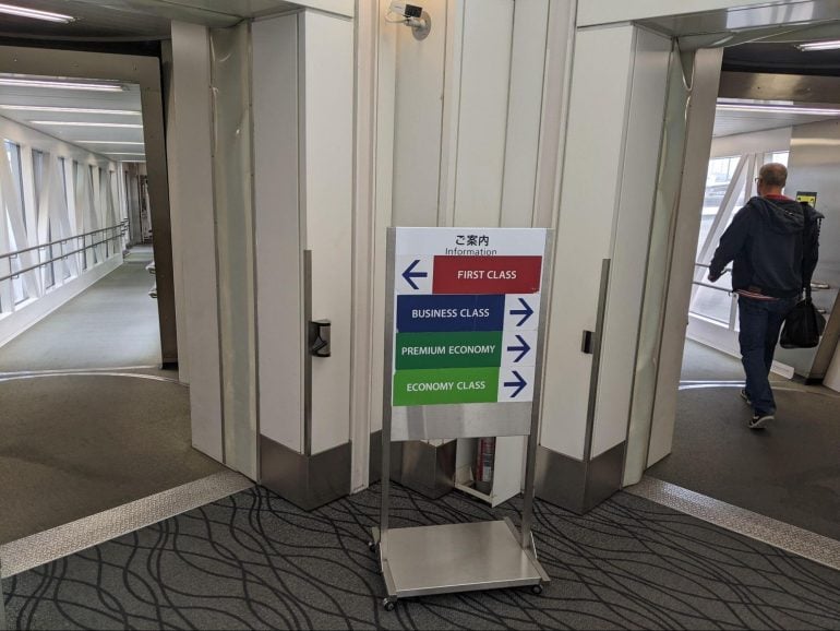 First class passengers were directed down the forward jetway. It turned out that my wife and I were two of just three first class passengers. Once all three of us had boarded, the crew closed that boarding door and the ground crew separated the jetway for departure as passengers continued to load through the second boarding door.