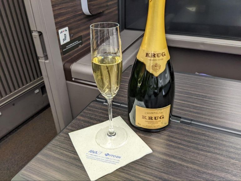 And this is no ordinary champagne. ANA served Krug Grande Cuvee (edition 167) on our flight. The flight attendants were more than happy to display the bottle that retails for over $200. Looking for something a little different? Well, Krug is just one of three champagnes served in ANA first class.