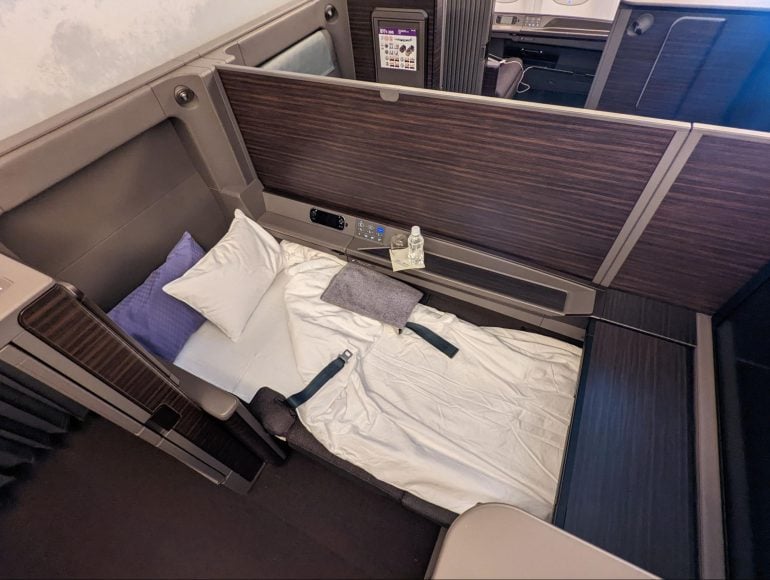 When we were ready to rest, flight attendants used the empty seats in the middle of the cabin to set up our beds. This meant that we could continue to enjoy our suite until the bed was made, rather than having to vacate our seats and wait while the beds were set up. To top off the service, our flight attendants left a bottle of water and a glass beside the bed.