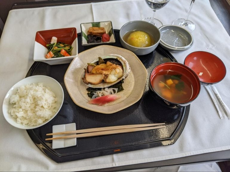 For my arrival meal, I opted for the Japanese menu of simmered meats, flounder, steamed rice and complements.