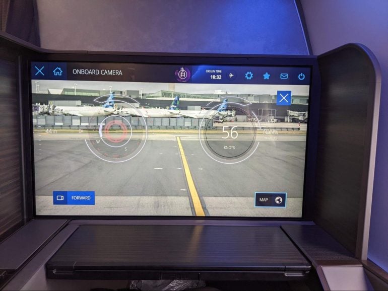 The suite's in-flight entertainment screen stretches 43 inches diagonally. Combined with the high-quality noise-canceling headphones, watching in-flight entertainment is quite the immersive experience. And AvGeeks rejoice: You can enjoy the flight through the onboard cameras.