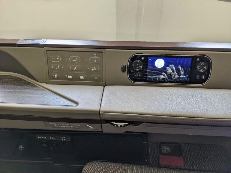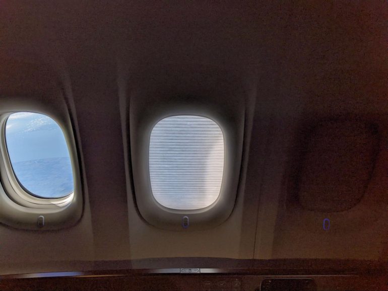 ANA first class window seats offer three windows. Each window has individual controls that you can use to lower a privacy shade or cover the window entirely. Or, you can utilize a button on your seat to open or close all three blinds at the same time.