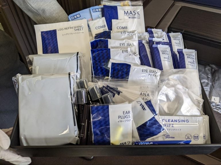 Also during boarding, a flight attendant passed through the cabin with a basket of additional amenities, including eye masks, moisturizing masks, combs, earplugs, cleansing wipes, dental kits, moisturizing sprays and more.