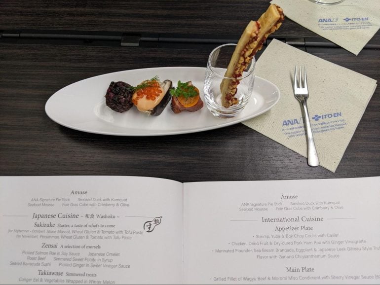 Once we were in the air, it was time to feast. Whether you order the Japanese or "international" menu, ANA first serves an "amuse-bouche" — a small plate of bite-sized appetizers. And although my wife and I both ordered the Japanese menu, the flight attendants proactively offered the caviar appetizer plate from the international menu.