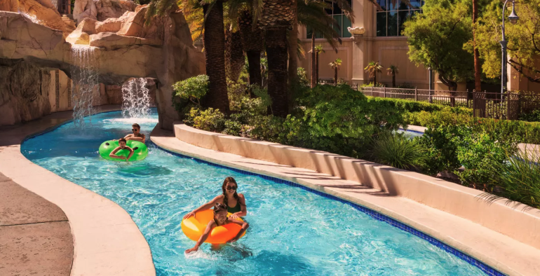 Located on the Strip, Mandalay Bay Resort and Casino is a favorite for travelers who enjoy spending time by the pool. The resort has its own faux beach with real sand, lazy river and wave pool, which provide a great respite from the desert sun.