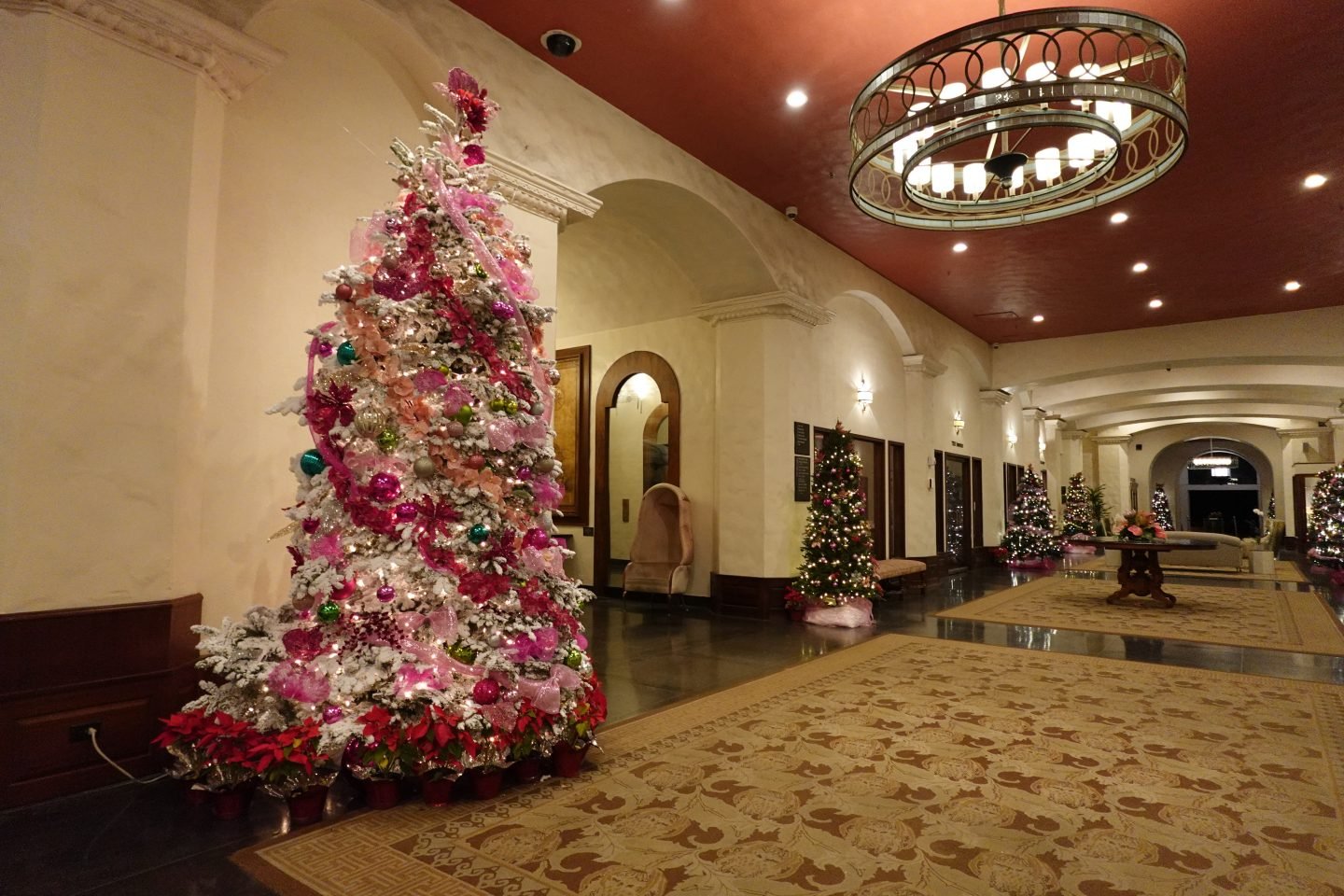 Hawaii’s hotels pull out all the stops for Christmas, decking their lobbies with glittering decorations, towering Christmas trees and elaborate sand sculptures. Among the best lobbies is the The Royal Hawaiian, a Luxury Collection Resort. Known as the "the Pink Palace of the Pacific" because of its iconic pink-painted exterior, the hotel leans into the pink vibes with pink Christmas trees throughout.