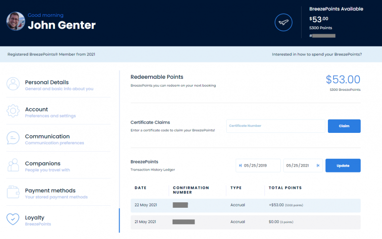 Breeze Airways requires that travelers create a BreezePoints profile to purchase a ticket, automatically enrolling flyers in the airline's reward program. Breeze travelers earn credit toward future travel in the form of BreezePoints.