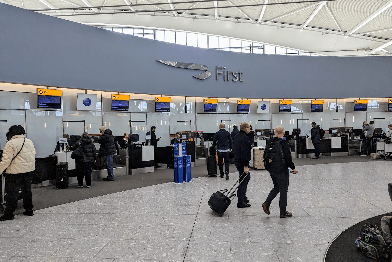 Travelers originating in London Heathrow can begin their journey in the first class check-in facility. There, first class check-in agents and dedicated security lines efficiently process passengers.