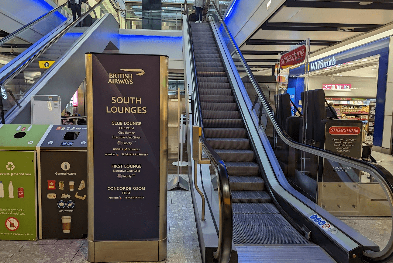 After clearing the difficult London Heathrow security process, you'll be directed left — away from the lounges and toward the airport's shops. Take the first escalator down and then circle backward to get to the British Airways south lounges.