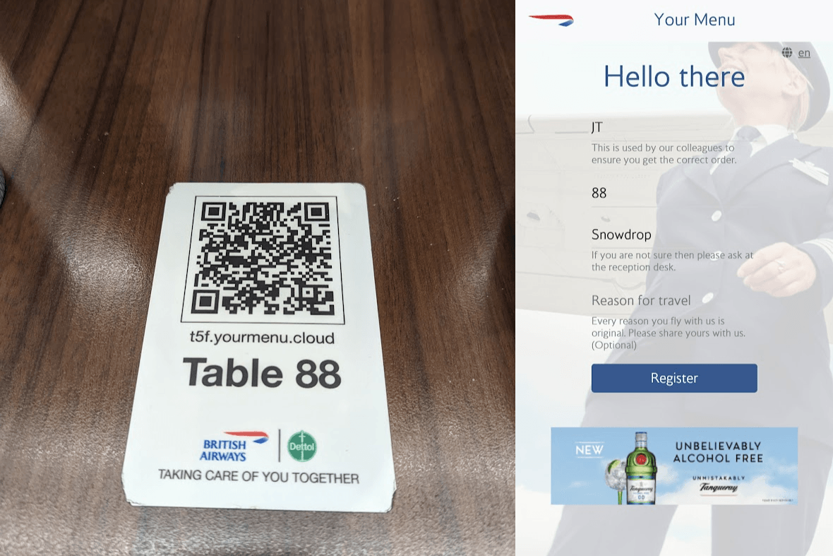 Travelers with a bit more time can order main dishes and drinks through the lounge's ordering app. To get started, scan the QR code printed on your table and enter your table number, your name and the secret code printed on placards throughout the lounge.