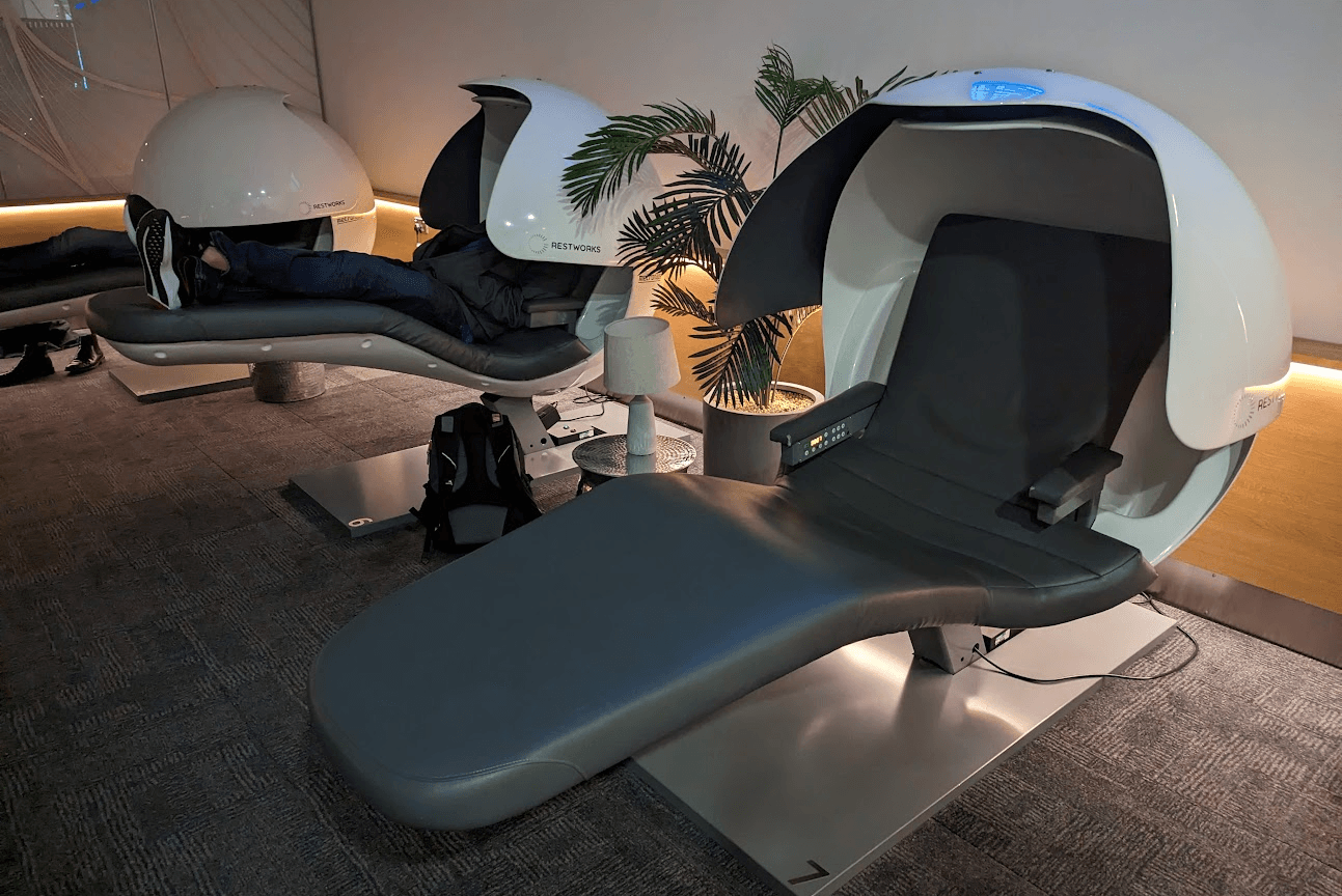 In the far back of the lounge, British Airways offers seven "Forty Winks" sleeping pods. Although Restworks offers an app and purports to show live availability, the pods are effectively first-come, first-served and often all occupied in my experience.