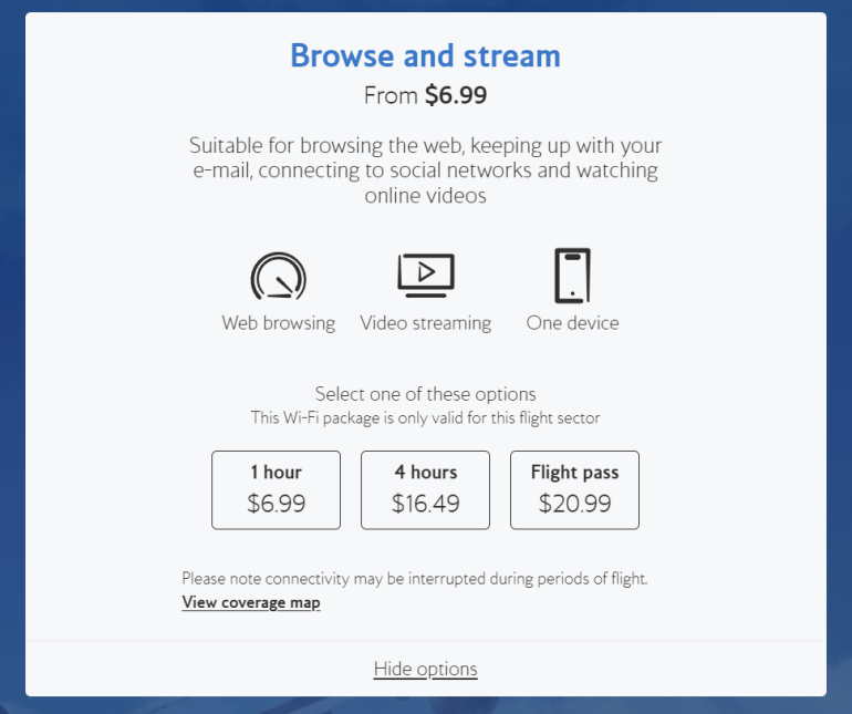 Let's take a flight from New York-John F. Kennedy to London-Heathrow as an example. When paying in US dollars, the faster "Browse and stream" connection costs: