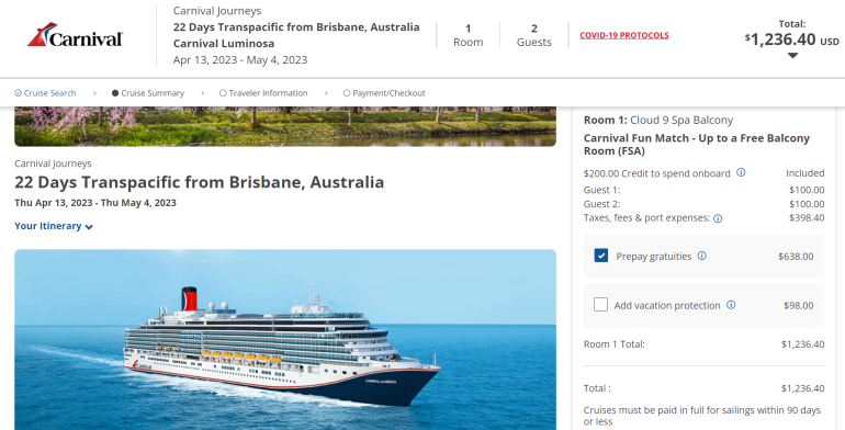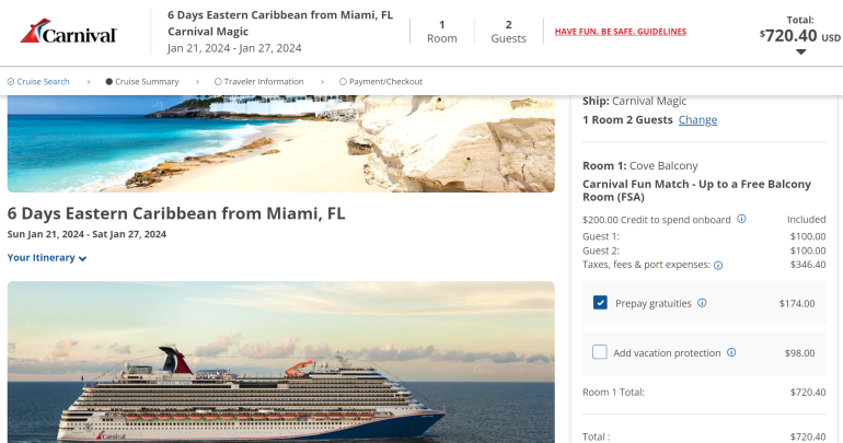 Still, you can get an incredible deal. For example, a six-night balcony cruise for two passengers costs a total of $720, including prepaid gratuities — and you'll get $200 back as onboard credits.