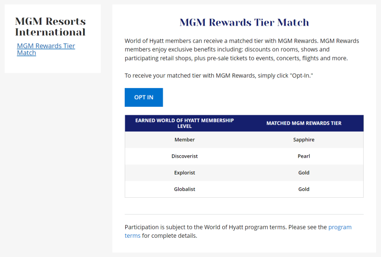 Start your match from Hyatt to MGM Rewards by logging into your World of Hyatt account. Then, go to Hyatt's MGM match page and click "opt in."