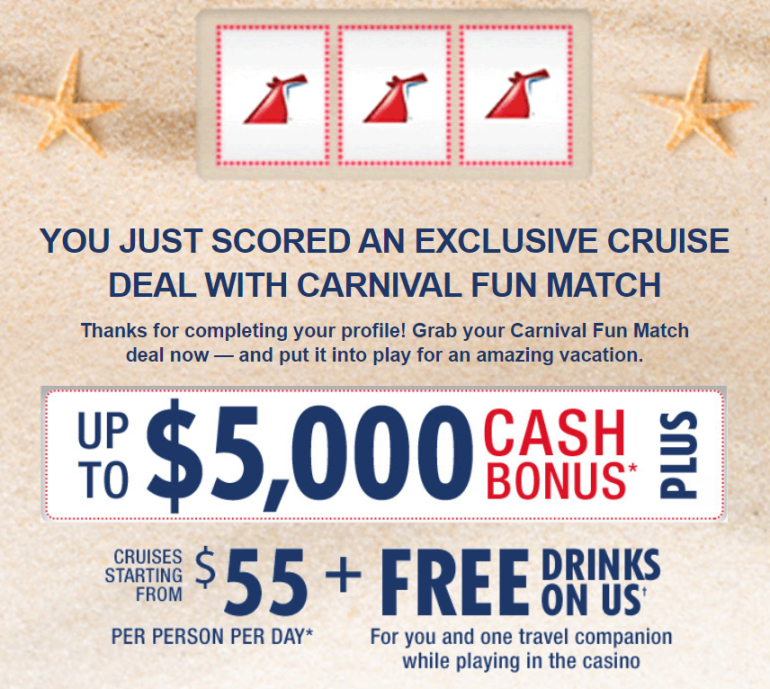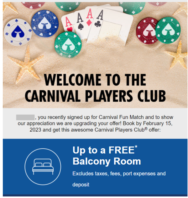 Be patient and you'll likely get a follow-up email from the Carnival Player Club with a much better offer — such as a "free" balcony room (before deposit, taxes and fees). This email is typically sent a few days after the first one.