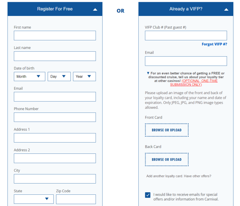 If you've cruised on Carnival before, enter your Very Important Fun Person (VIFP) Club number and email to shortcut entering your personal information. Otherwise, enter your name, date of birth, phone number and address.