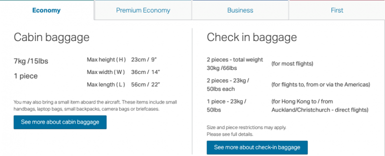 On economy flights, passengers are allotted two checked bags with a combined weight of 66 pounds (on most flights), plus a carry-on of 15 pounds not exceeding 9 inches by 14 inches by 22 inches. Premium economy has a slightly higher checked baggage weight allowance of 77 pounds, but otherwise its policies are the same as economy.