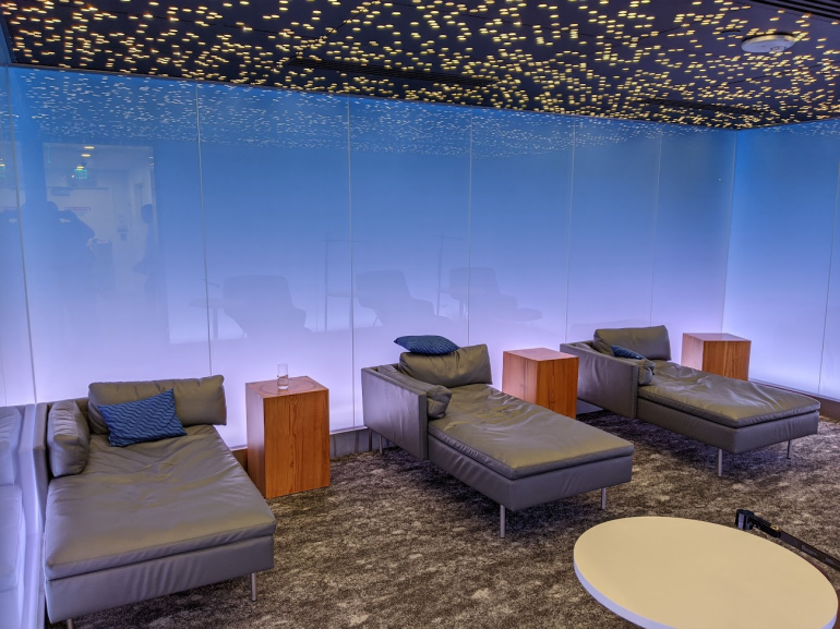 Near the back of the sprawling lounge, guests can find a quiet room with three chaise lounge chairs and a few standard chairs. This dark room can be a great place to catch a quick jetlag-busting nap. Chairs are first-come-first-serve and can't be reserved.