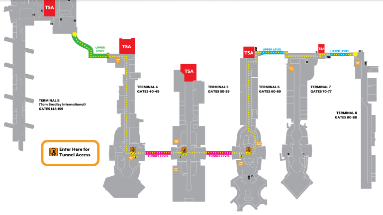 Passengers departing from Terminals 2 and 3 can use the airside bus to connect between TBIT and those terminals. That just leaves Terminal 1 — primarily used by Southwest — as the only terminal not connected airside.