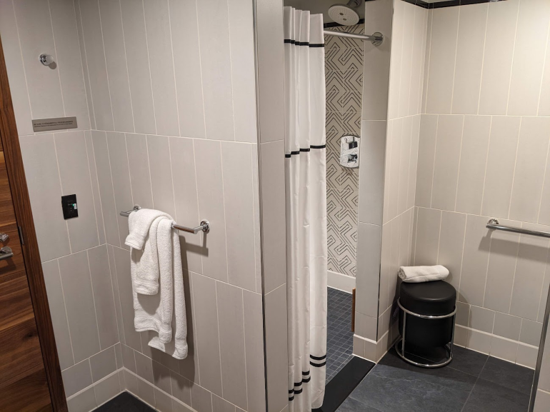 The large and accessible-friendly shower suite has a sink, toilet and shower with a rainfall and handheld shower nozzle. A small stool is provided for ease in removing your shoes.