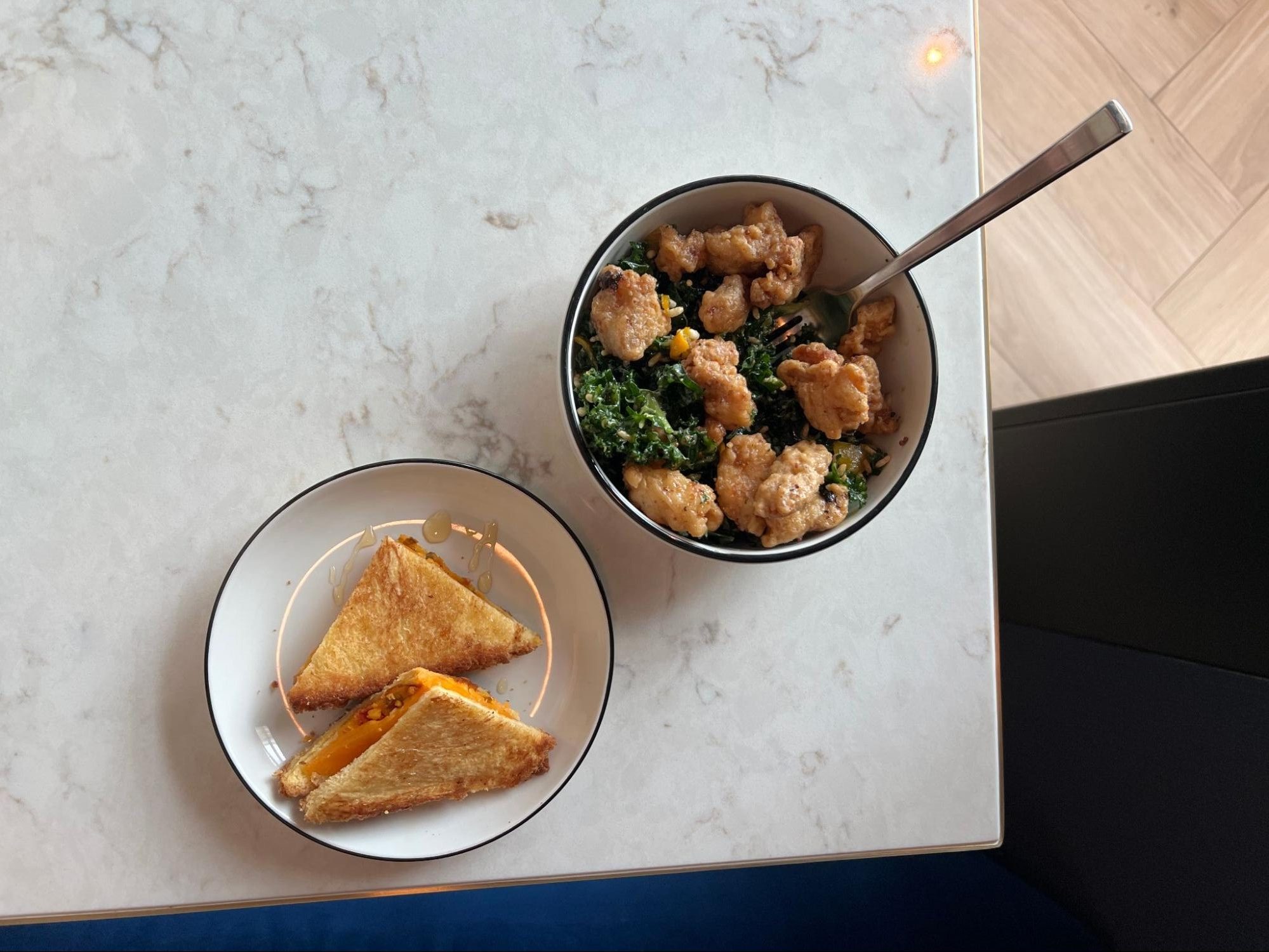 The kale avocado salad topped with truffled chicken and the pressed cheese at Chase Sapphire PHL. (Photo by Benjamin Din)