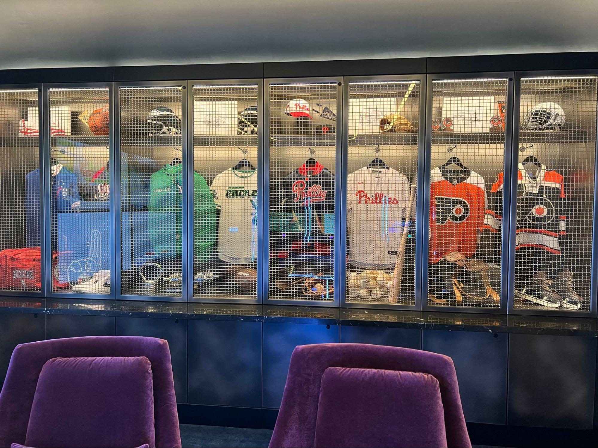 The Philly sports memorabilia wall at Chase Sapphire PHL. (Photo by Benjamin Din)