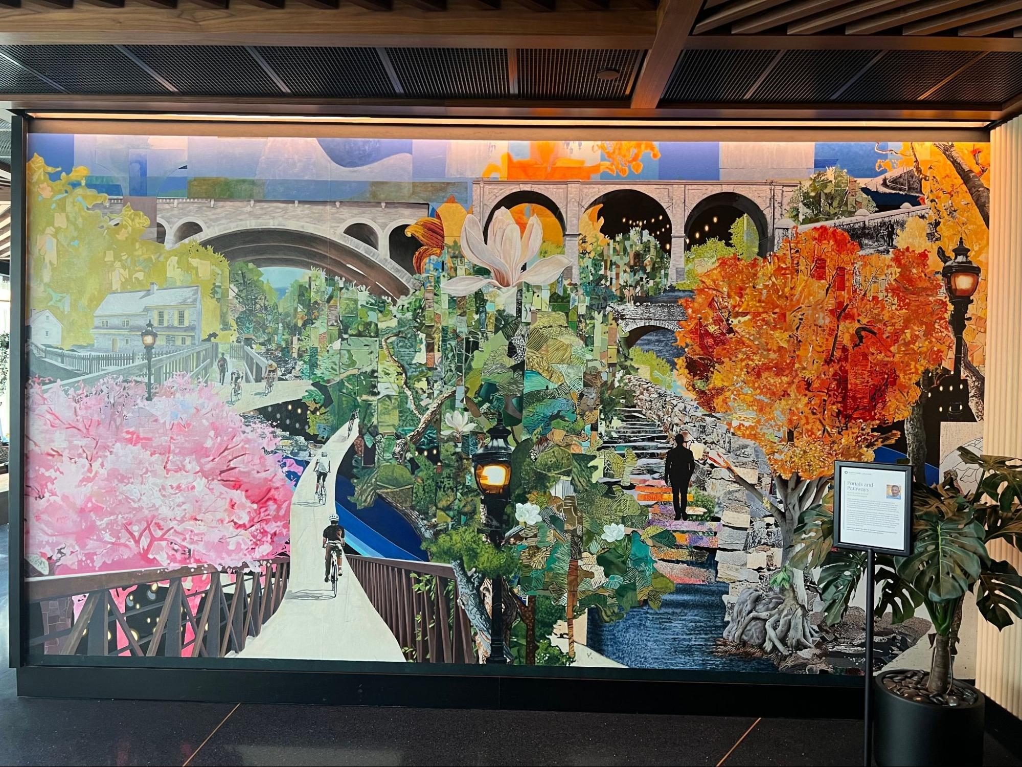 Here, you’ll also find a mural by local artist James Burns, who grew up in the area and was inspired by his favorite spots in Philly. The piece was designed for the space and pays tribute to the city’s portals and pathways, such as Pennypack Creek.