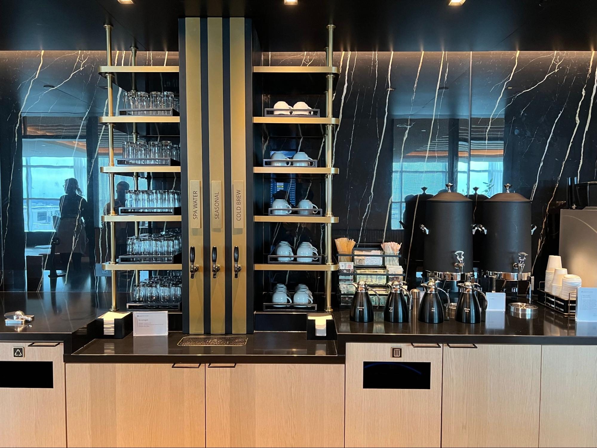 There are beverage stations available throughout the lounge, including coffee roasted by local chain Elixr Coffee.