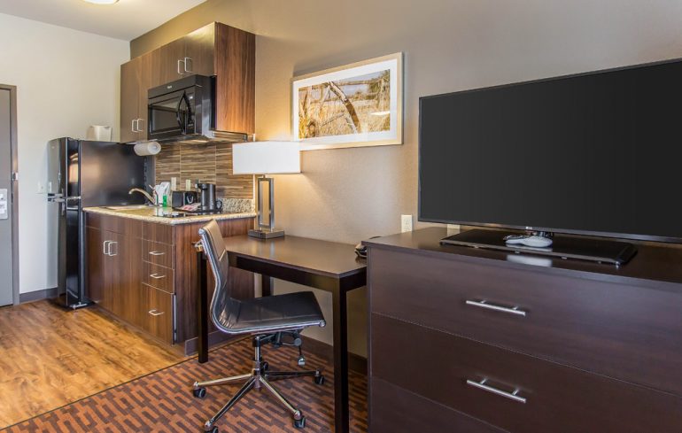 Travelers who work away from home for longer stretches of time need the benefits of apartment living without the commitment of signing a lease. Everhome Suites aims to be your home away from home — and your office away from the office. These properties feature inviting public areas where guests can gather when they want to get out of their own suites. There’s also a meeting room, fitness center and swimming pool. In addition to weekly housekeeping services and public laundry facilities, some of the one-bedroom suites have their own laundry machines.