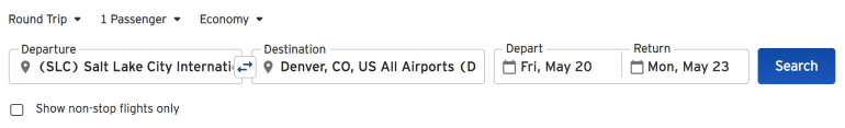 Let’s say you want to book a flight. Select the “Flights” tab and begin your search. Select your trip type (round trip, one way or multicity), and enter the number of passengers and preferred class of service. Input your departure and destination cities and travel dates. Check the nonstop box if necessary and select “Search.”