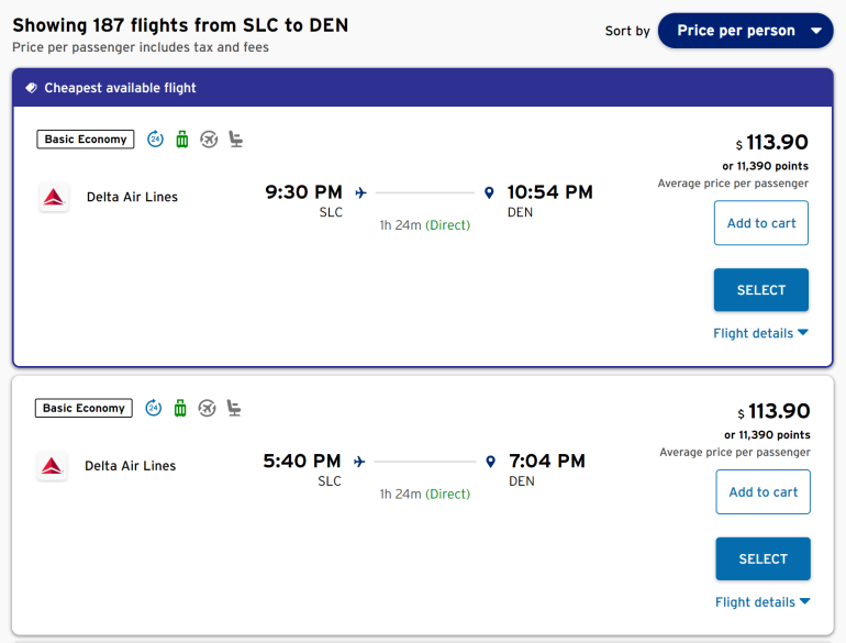 Here’s an example of a flight booking through the portal: a flight from Salt Lake City to Denver aboard Delta Air Lines. You can see, it’s available for $113.90 or 11,390 ThankYou points — a 1 cent-per-point rate.