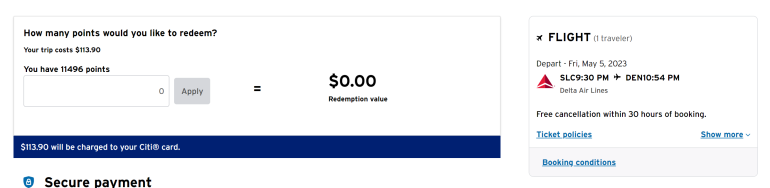 Once you select the fare, you’ll have the option to select a payment method: using ThankYou Points or a Citi credit card. If you choose to redeem points, you can either pay in full or redeem for a partial payment.