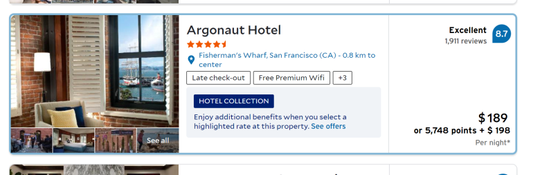 Here’s one property in San Francisco — the Argonaut Hotel, not far from Fisherman’s Wharf — available as part of the Hotel Collection. As you can see, the listing explicitly mentions late checkout and free premium Wi-Fi as a perk for this booking.