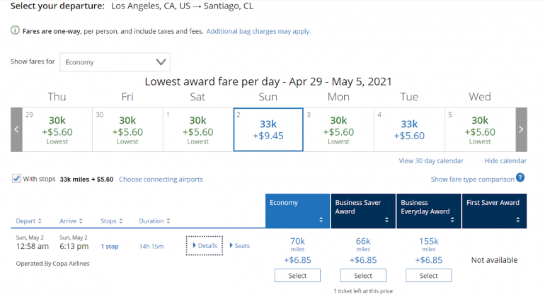 For example, if you want to book a Los Angeles to Santiago one-way business class ticket on United Airlines, it would run you 66,000 miles. You could also book the same ticket on Air Canada for only 60,000 miles — both are great deals when compared to paying upward of $1,700 in cash for the same flight.