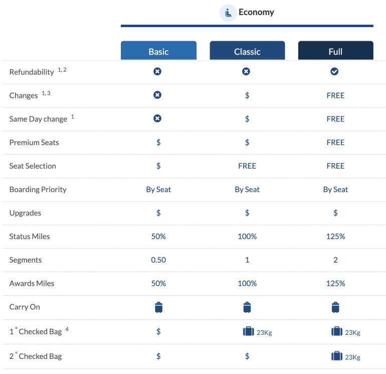 Full economy fares come with complimentary seat selection and premium seats (usually closer to the front of the plane, and occasionally with more legroom), two checked bags, free flight changes and increased award and status mileage earnings. They’re also fully refundable.
