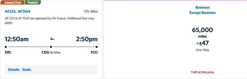 Let’s say you want to start in India and head to Europe. For the dates we searched, Delta will charge 65,000 SkyMiles in business class for a one-way ticket and just $47 in taxes. That’s a pretty good deal for a ticket that would cost around $2,100 one-way for the same flights.