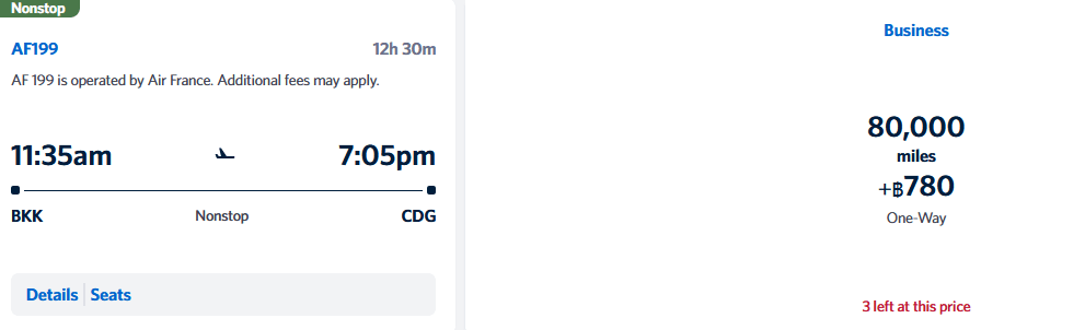 A nonstop, one-way redemption from Bangkok to Paris on Air France costs 80,000 miles plus around $27 in taxes as of September 2025. This is a longer flight than many transatlantic flights from the U.S. to Europe and can cost fewer miles.