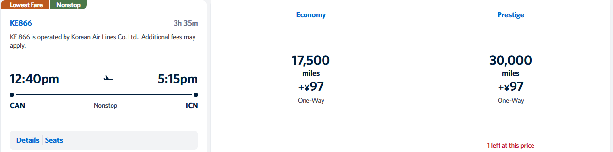 For as few as 30,000 miles, you can travel one-way within Asia in business class, plus taxes and fees. The above flight is nearly 3.5 hours on Korean Air between Guangzhou, China, and Seoul Incheon; the taxes at press time equate to under $14.