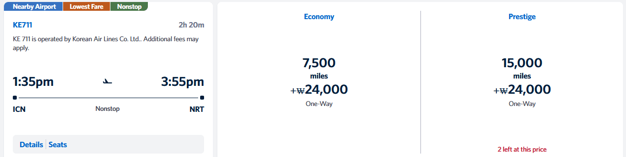 And if you are flying solely between Korea and Japan on Korean Air, you can fly in economy for only 7,500 SkyMiles or business class for 15,000 miles each way. The taxes are the same for both cabins; the currency conversion at press time was about $17. While availability varies, these examples show that there are still some deals to be had when using SkyMiles internationally.