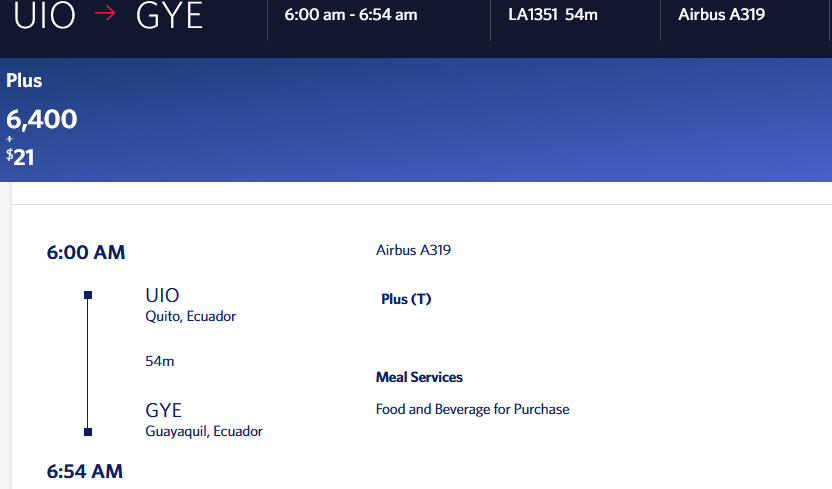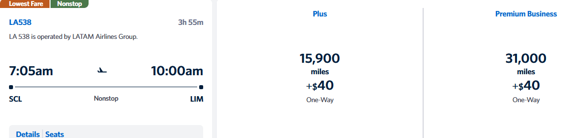 It follows a distance-based chart for flights within South America, segment by segment, which means the shortest flights (under 250 miles, like between Quito and Guayaquil, Ecuador) cost only 6,400 miles each way. And a one-way business class ticket between Santiago, Chile and Lima Peru (1,524 miles in length) costs 31,000 miles plus $40 in taxes. Economy class is roughly half that cost in miles, but a similar amount in taxes.